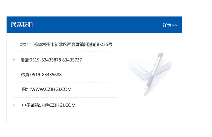 地址:常州市新北區友邦商務大廈1幢16、17層  電話:0519-85101652  傳真:0519-85112595  郵編:213022  網址:www.cz-jiayue_cn.1000ri.com  郵箱:xiajifengaa@163.com